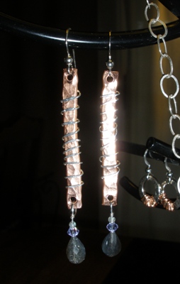 Wrapped up (earrings of copper, Labradorite, Aquamarine, fine silver)