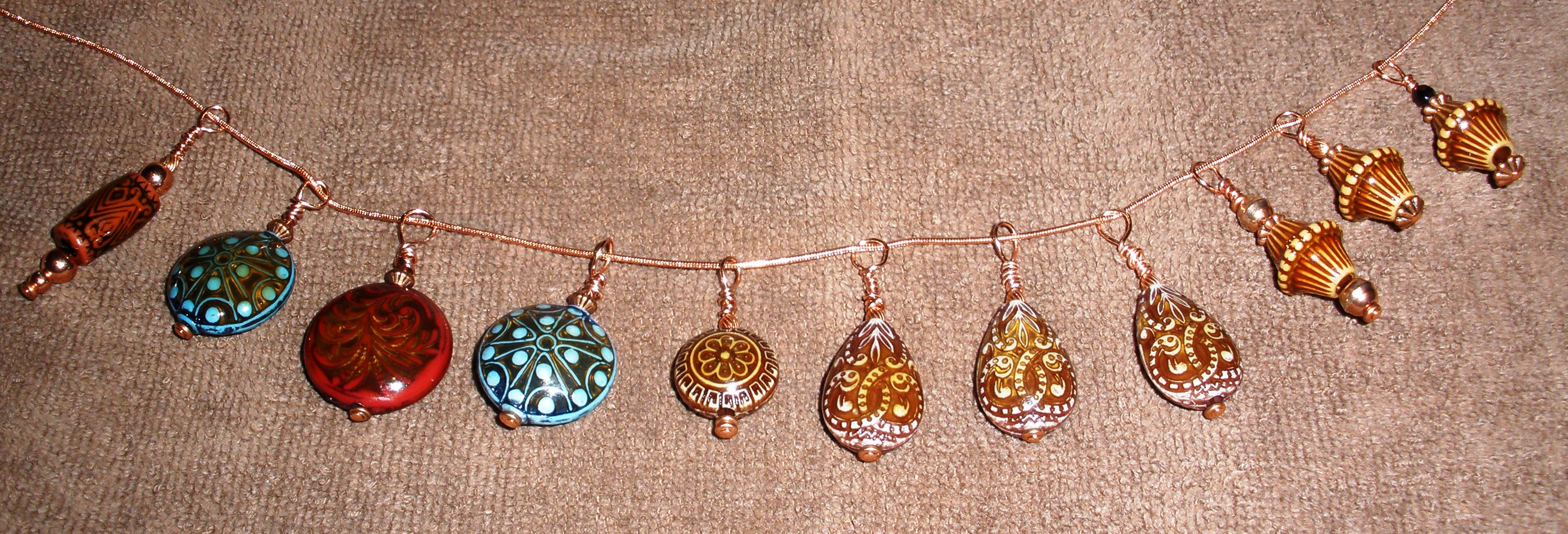 This year I lucked into a stash of old-fashioned beautiful lampworked tree light beads which are now earrings and pendants in red, green, blue, amethyst, turquoise, pink, yellow, and amber.