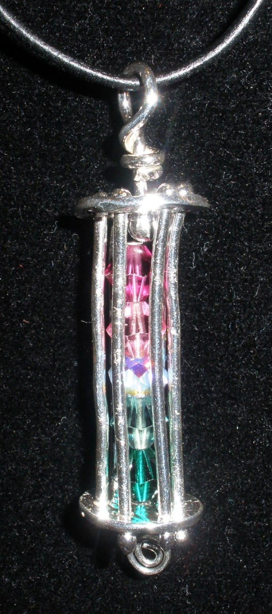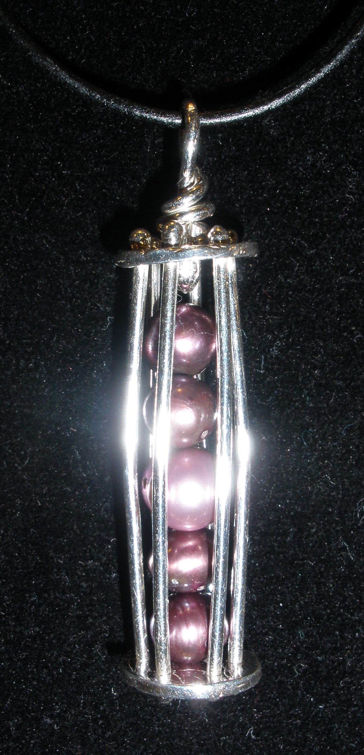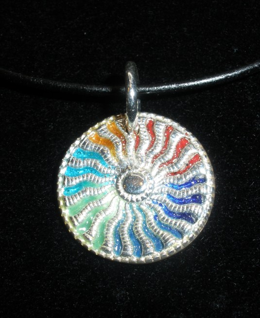 “Personal Sunshine” is a fine silver pendant capturing a free-spinning sun-face with a golden patina between its layers. It’s embellished with copper wrappings to embrace its warmth, accentuated with blue pearls and crystal dangles and silver charms to reflect the sky, and features a peek-a-boo fine silver mesh window in the back, on a 24″ s.s. chain.Coordinating fine-silver earrings with copper wrappings complete the set.